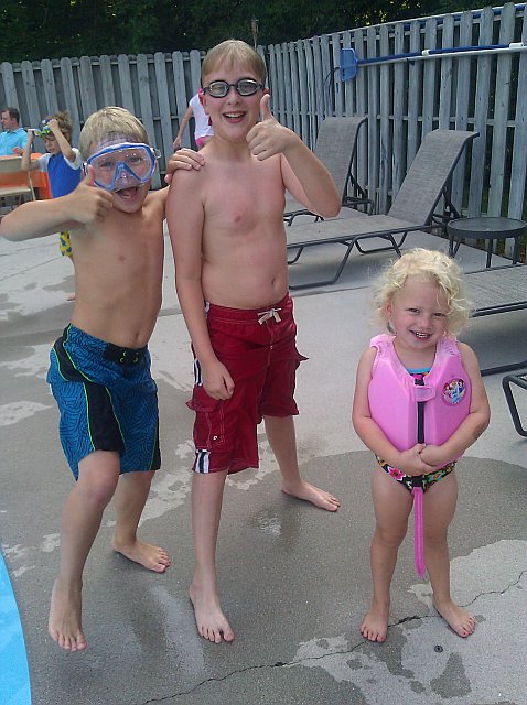 Saturday night their neighborhood had a pool party/potluck dinner. The kids had a great time! (Minus Callie, who was a mess and had to go home less than 10 minutes in.)